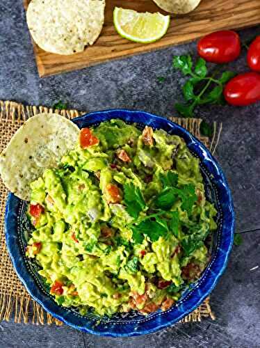 Delicious and chunky vegan guacamole with chopped onions, juicy tomatoes, and just the right amount of lime, along with cilantro, cumin, and a hint of spice!