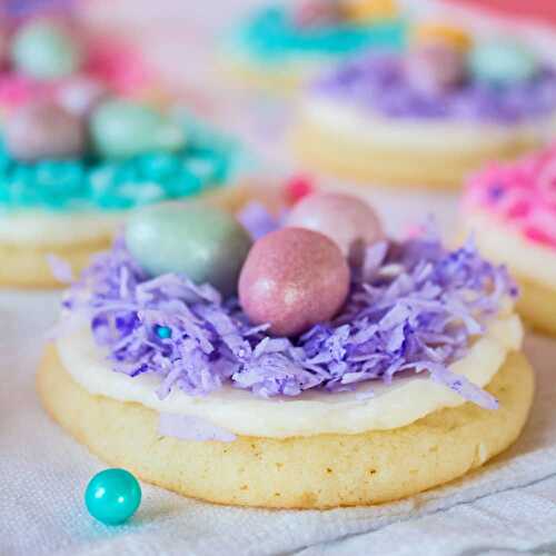 These fun Easter Basket Cookies are easy to make and full of delicious flavors! The colored coconut egg nest sits on top of a super soft sugar cookie with a layer of tasty buttercream frosting to hold Cadbury's shimmer mini chocolate eggs in place! Top.
