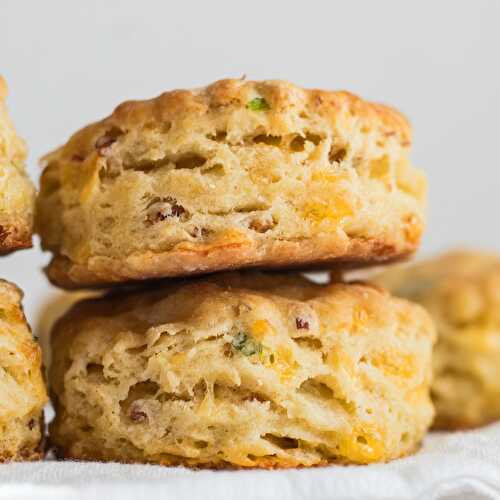 My easy to make Cheddar Bacon Chive biscuits are loaded with cheddar cheese, crispy bacon, and fresh chives making them perfect to serve with breakfast or dinner! The savory flavors are found in each bite of these tender, flaky buttermilk biscuits!!