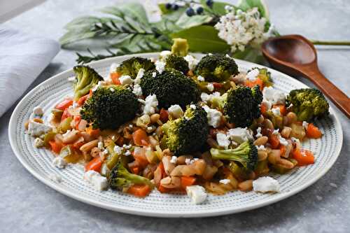 Looking for a easy one casserole dish? This is a healthy dish made with canellini beans, summer vegetables, topped with steamed broccoli and feta cheese.
