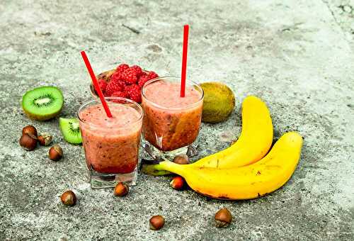 The banana kiwi raspberry hazelnut smoothie is a delicious blend of fruits, almond milk and chopped hazelnuts.
