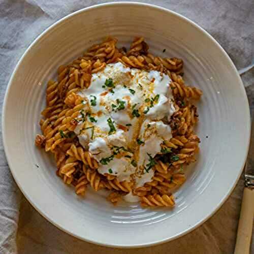 Turkish Makarna Salatası is a healthy pasta salad consisting of cooked pasta mixed with yoghurt, mayonnaise, fresh vegetables and herbs.
