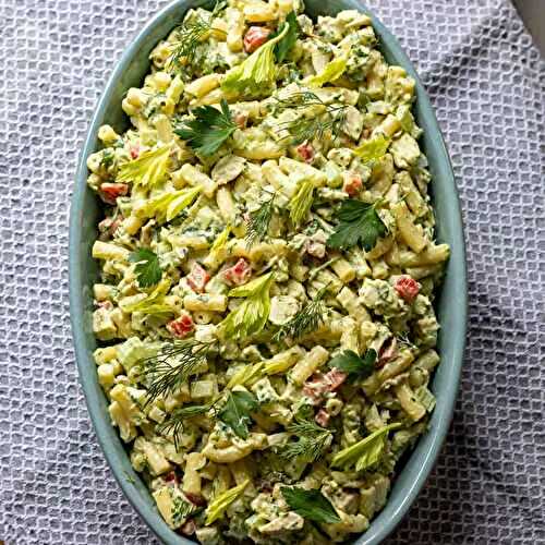 Turkish Makarna Salatası is a healthy pasta salad consisting of cooked pasta mixed with yoghurt, mayonnaise, fresh vegetables and herbs.