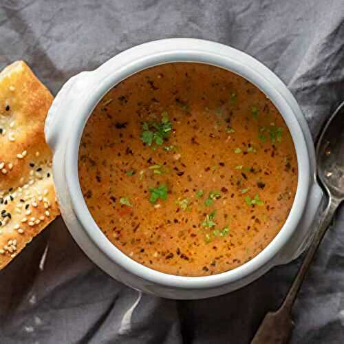 Arpa Şehriye Çorbası, or Turkish Orzo Soup, is a comforting and delicious tomato-based soup made with orzo pasta, and chicken stock, and flavored with garlic, mint, and flaked chili.