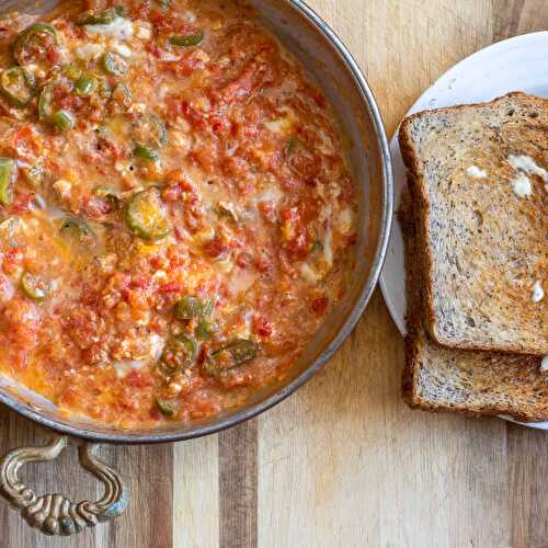 Menemen or Turkish Scrambled Eggs is a very popular and loved breakfast dish in Turkey made with juicy tomatoes and green peppers.