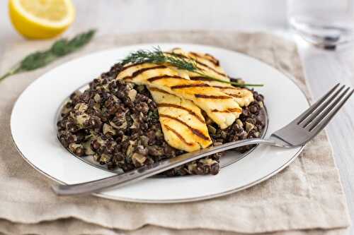 Creamy dill and caper lentils with grilled halloumi - This easy and delicious vegetarian lunch or dinner can be whipped up in just 15 minutes!