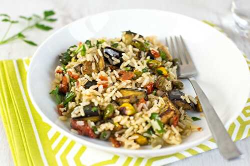 Warm brown rice salad with roasted aubergine and pistachios - a seriously tasty and healthy vegan / vegetarian lunch or dinner!
