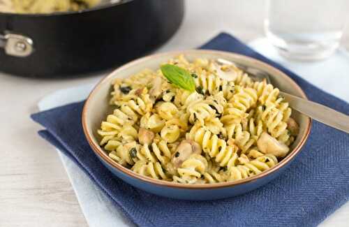 Creamy goat's cheese and mushroom pasta with walnuts and basil.