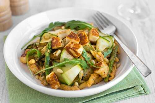 Asparagus and halloumi pasta with an unbelievably delicious smoky tomato pesto, made with Greek yogurt so it's extra creamy! A great easy vegetarian dinner.
