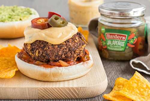 Vegetarian nacho burgers with homemade nacho cheese sauce - a simple black bean burger with crushed tortilla chips, jalapenos, salsa and avocado.