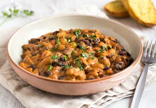 Creamy three bean stew - healthy comfort food! The stew is totally vegetarian, but is still really high in protein, and the sauce is really rich and creamy.