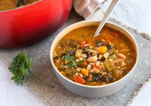Tuscan bean and veggie soup - a super hearty vegetarian / vegan soup that's full of veggies, barley and beans! Comfort food made healthy!