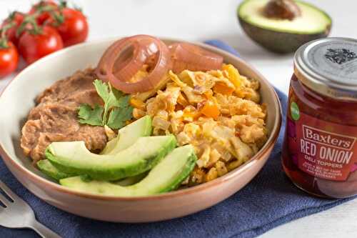 Breakfast rice and beans! This delicious vegetarian recipe contains a complete protein, healthy fats and tons of veggies.