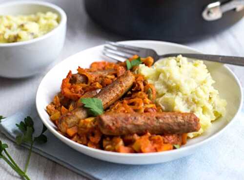 Vegetarian sausage casserole - a rich, tomatoey stew with vegan sausages and heaps of veggies.