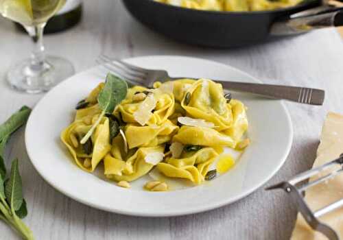 A really quick and easy recipe for buttery tortellini, served with fresh sage, pumpkin seeds, and parmesan cheese.