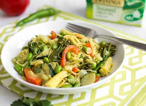 These tasty curry noodles are made with green tea and coconut milk for a creamy, mellow sauce.