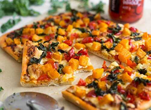 This spicy butternut squash pizza with crispy kale is the best pizza I've ever had! It's spicy, sweet, crispy, cheesy.