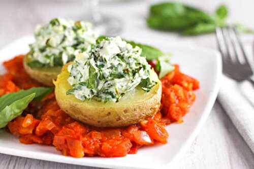 Why should potatoes always be on the side? Try these stuffed potatoes, with spinach, ricotta, and a rich tomato sauce - let the potatoes be the star!