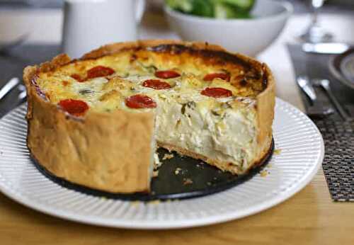 This cauliflower cheese tart combines a light, cheesy filling with juicy roasted tomatoes and flaky shortcrust pastry.