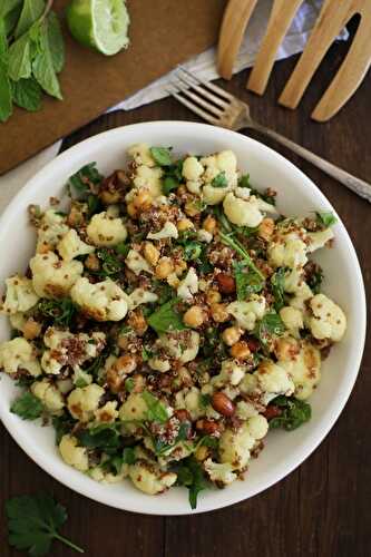 This gorgeous quinoa salad with roasted cauliflower and chickpeas is served in a zingy jalapeño-lime dressing - delicious!