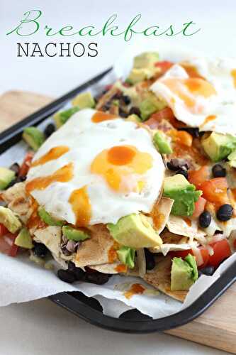 Breakfast nachos make a perfect weekend brunch! Homemade tortilla chips with black beans, cheese, avocado and a fried egg - remember to make the yolk runny!
