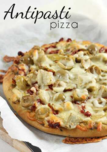 This antipasti pizza is heaped with tasty Italian ingredients - olives, artichokes and sun-dried tomatoes, along with basil pesto! A great fridge clearer!