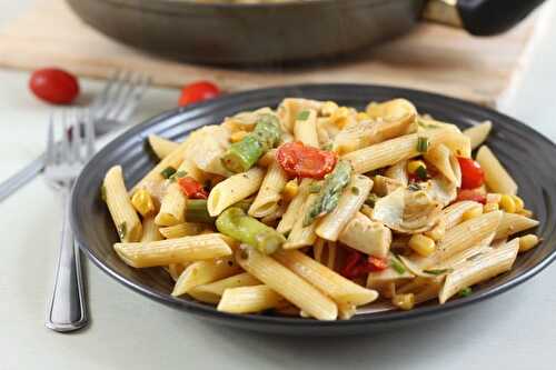 Veggie pasta with tons of asparagus, artichokes, corn and tomatoes - the vegetables give so much flavour to this recipe!