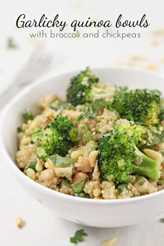 These healthy vegan quinoa bowls are PACKED with flavour! Fresh broccoli, crunchy pine nuts, fluffy quinoa and lemon and parsley dressing- good hot or cold!