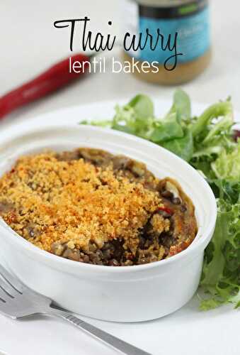 These vegan lentil bakes are flavoured with Thai curry paste and coconut milk, and topped with crispy chilli and garlic breadcrumbs!