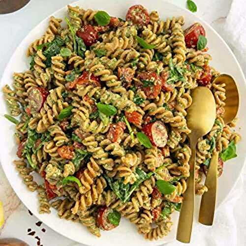 A quick homemade pesto and fresh ingredients come together for the perfect plant-based summer pasta salad.