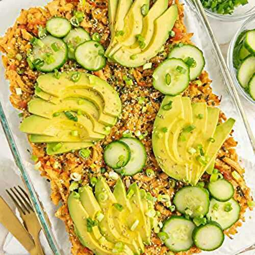 Tangy sushi rice, rich sriracha soy curls, and fresh toppings come together for this super flavor plant-based take on a viral recipe.
