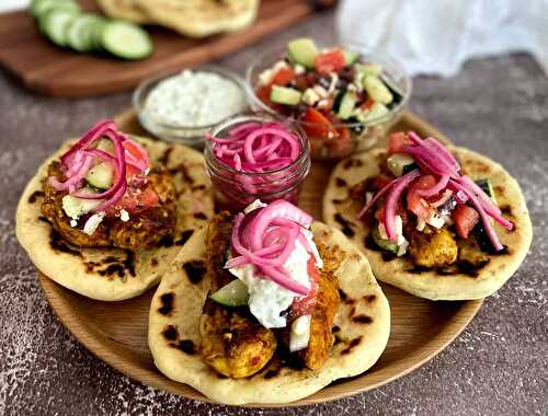 These Shawarma Chicken Wraps are full of spicy marinated chicken and topped with fresh veggies, feta cheese, tzatziki sauce, and pickled onions.