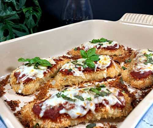 Baked Chicken Marinara has breaded baked chicken topped with marinara sauce and cheese.