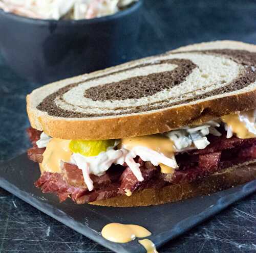 The corned beef sandwich is a Jewish deli classic piled high with sliced corned beef, coleslaw, pickles and Russian dressing.