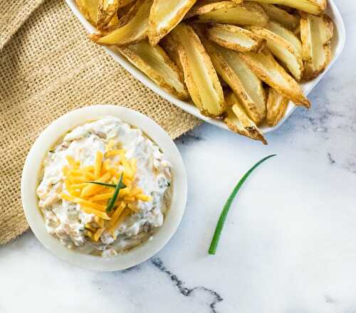 Loaded baked potato dip is a phenomenal party appetizer brimming with smoky bacon, shredded cheese, green onions, and sour cream.