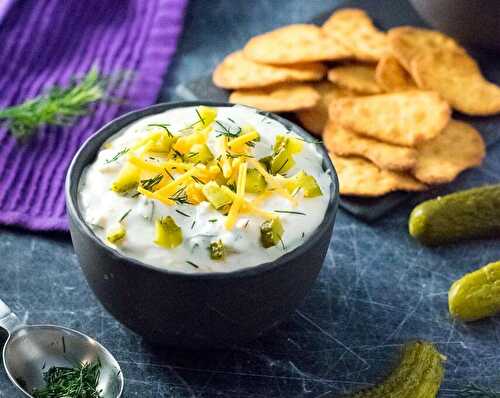 Each dollop of this Cheddar Dill Pickle Dip is packed with the bright flavor of dill, crunchy pickles, and shredded cheddar cheese.