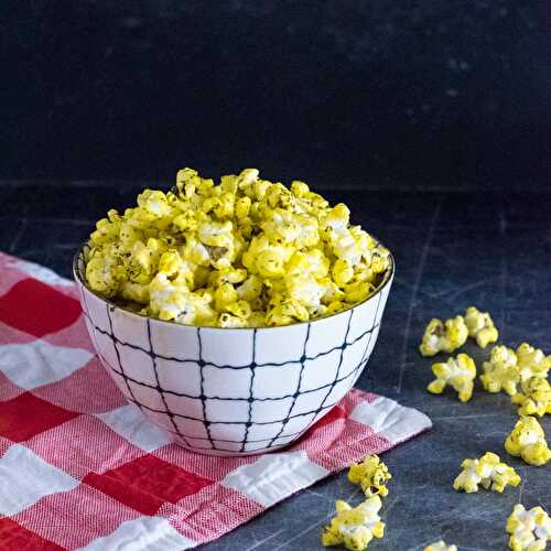 This homemade dill pickle popcorn is coated in the tangy flavor of vinegar, dill, and seasonings! It is the perfect way to liven up movie night!