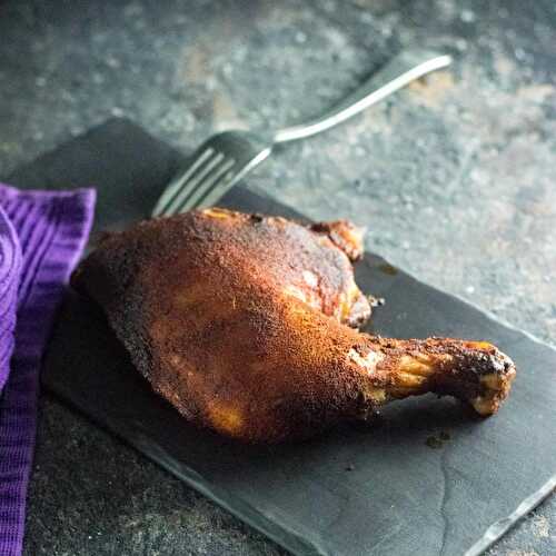 These exceptionally tender and juicy smoked chicken quarters are dusted with a BBQ dry rub and smoked to delicious perfection.