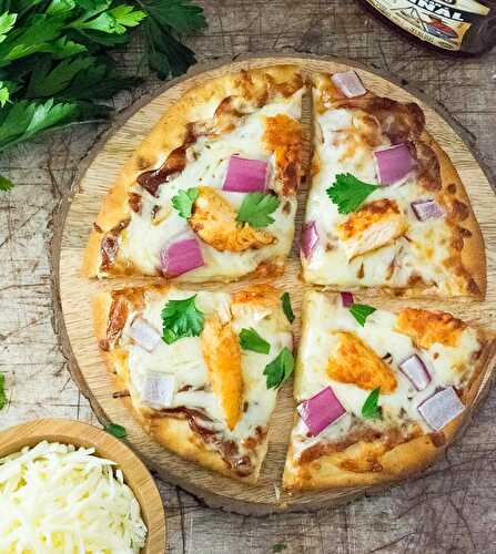 This easy BBQ chicken pizza is topped with tender seasoned chicken, smoked cheese, and a bold slathering of BBQ sauce on crisp and chewy naan bread.