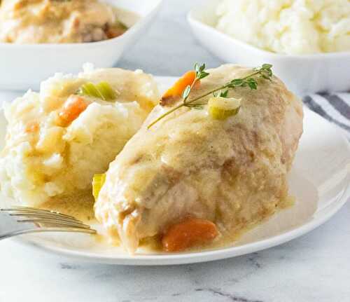Smothered chicken and gravy is perfect Sunday supper comfort food featuring tender chicken simmered in a luxurious gravy with carrots, onion, and celery.
