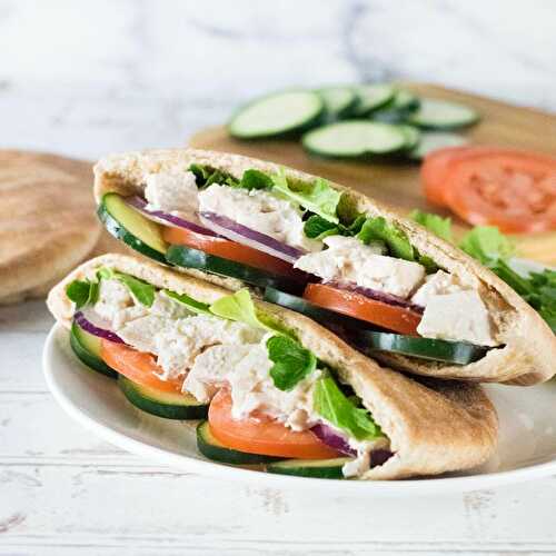 This chicken pita sandwich is loaded with fresh vegetables and tender chunks of chicken tossed in a bright and tangy sauce.