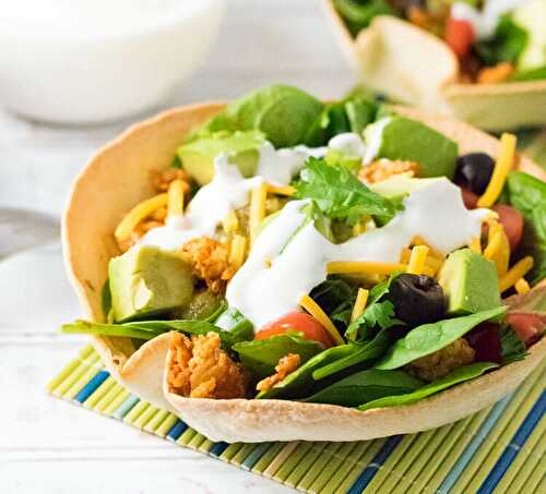 This Healthy Chicken Taco Salad is loaded in a homemade taco bowl brimming with spinach, avocado, and more, then drizzled with a tangy lime sour cream sauce.
