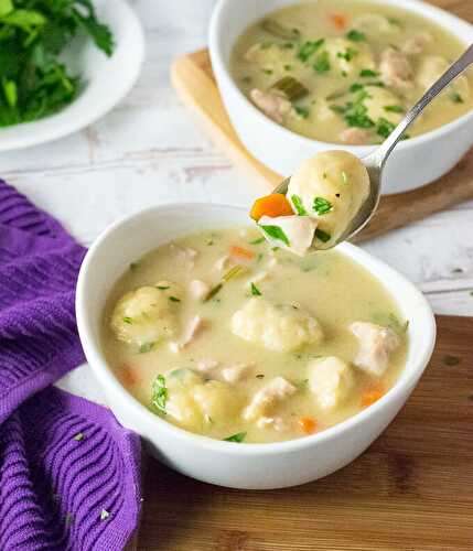 Making chicken and dumplings from scratch is a comfort food classic! Tender chicken swims in a creamy herb broth surrounded by plenty of hearty dumplings.
