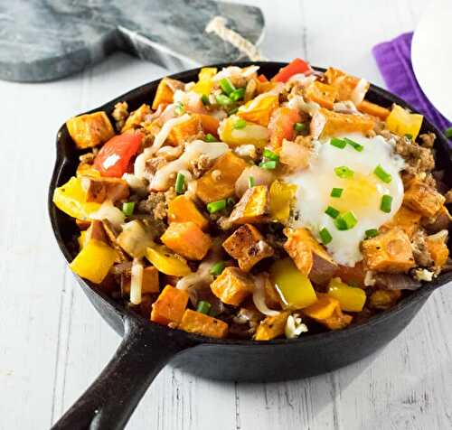 This hearty sweet potato breakfast hash is loaded with tender sweet potatoes, breakfast sausage, peppers, and onions.