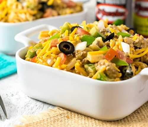 A bold smoky sauce coats the tender noodles, seasoned beef, and chunky vegetables in this Creamy Taco Pasta Salad.