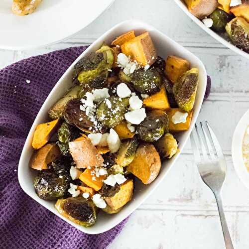 Roasted sweet potatoes and Brussels sprouts are a flavorful side for any meal.