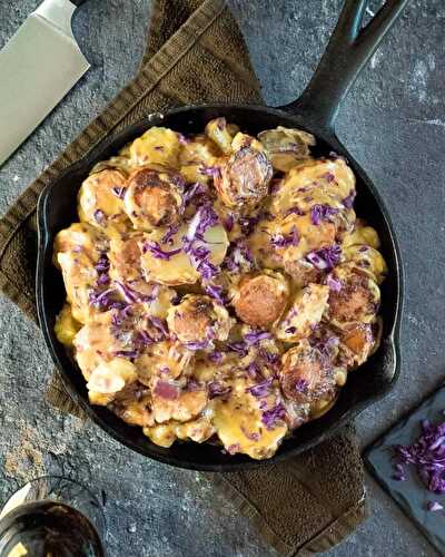 This Cheesy Kielbasa and Potato Skillet is an easy meal solution that packs hearty kielbasa, potatoes, onion, and cabbage in one cheesy skillet!