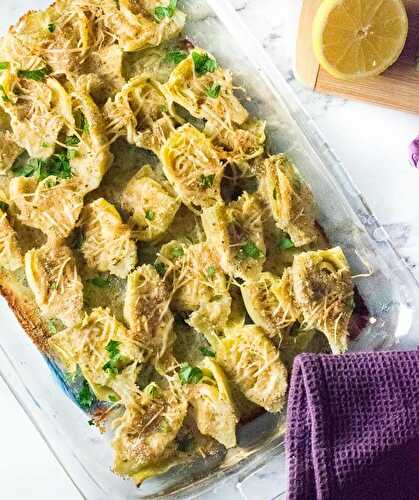 These parmesan baked artichoke hearts are splashed with lemon juice and then dusted with seasoned breadcrumbs and Parmesan cheese.