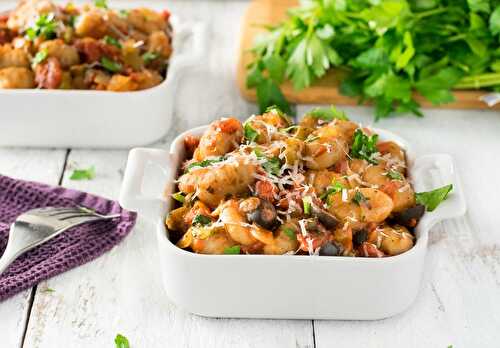 This Healthy Italian Gnocchi features pillowy soft gnocchi bathed in a briny vegetable sauce with diced tomatoes, capers, black olives, and more.