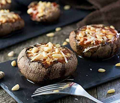 These hearty roasted portobello mushroom caps are loaded with pasta sauce, parmesan cheese, and crunchy pine nuts.